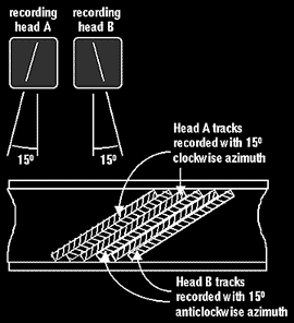 Compared with early video recorders, modern day video recorders have their video tracks lying right next to each other. To avoid interference, the two video heads are angled slightly away from each other. As a result, the video head openings that transmit the magnetic tracks to the tape, create an angle between them. The heads are 15 degrees angled in opposite direction, making a total angle of 30 degrees.This diverted registration angle ensures no problems are caused if the heads slightly lose track when playing back and touch the next track. The heads only register tape information at an angle that precisely corresponds to the position of the head opening. This system is called the azimuth recording system. If the video heads stray too far from the track, which could lead to distorted images, tracking control can correct this.