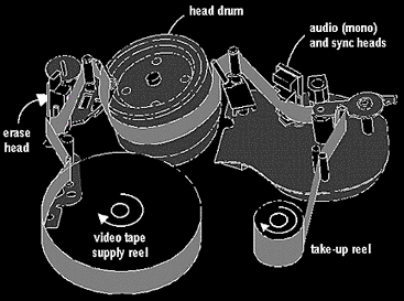 However, to register video signals, a range of 3.2 MHz is required and so a tape speed of approximately 5 meters per second is a prerequisite. This is over 100 times as fast as the tape speed for an audio cassette deck. The required high recording speed for video recorders is realized by the helical scan system without such high tape speeds. The system basically consists of a revolving head drum, that has a minimum of two video heads.