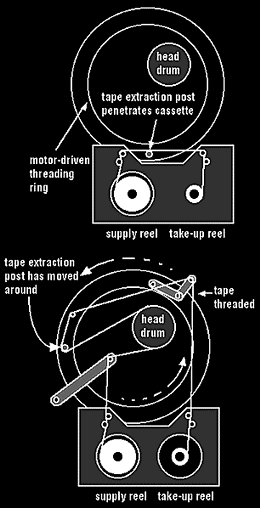 Tape guidance along the head drum with the video heads writing tracks on the tape.