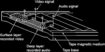 In the case of hi-fi, the audio signal is also put on tape via revolving heads similar to the video signal, not on the linear track. As there is no space between the video tracks, as the video tracks lie right next to each other with no space in between, the audio tracks need to be recorded in the same place as the video tracks. The way this is realized is by recording the audio signal under (deeper than) the video signal.