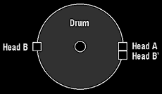 Placement of three video heads on the head drum. During recording and normal playback, heads A and B are used. For still picture heads B and B' scan the same video track for noise-free reproduction.